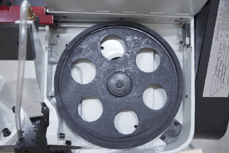 Механическая дисковая щётка (приводимая в движение от движения полотна). Зубчатый блок, с твёрдосплавными платинами и подшипниками для выпрямления полотна в зоне резания и качественной фиксации для стабильного пиления. |